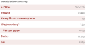 Skład; Mięso Wieprzowe, Mięso Wołowe, Jelita Wieprzowe, Sól, Pieprz, Czosnek, Sól Peklowa(e250) z 111g Mięsa otrzymujemy 100g produktu