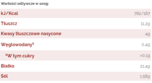 Skład; Mięso Wieprzowe, Jelita Wieprzowe, Sól, Pieprz, Czosnek, Majeranek z 111g Mięsa otrzymujemy 100g produktu